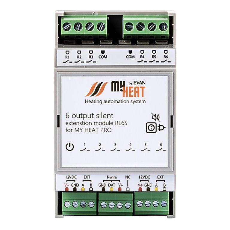 Симисторный блок расширения MY HEAT RL6S подключается к контроллеру по проводной шине и предназначен для бесшумной коммутации дополнительных шести выходов электрической нагрузки посредством симистора.